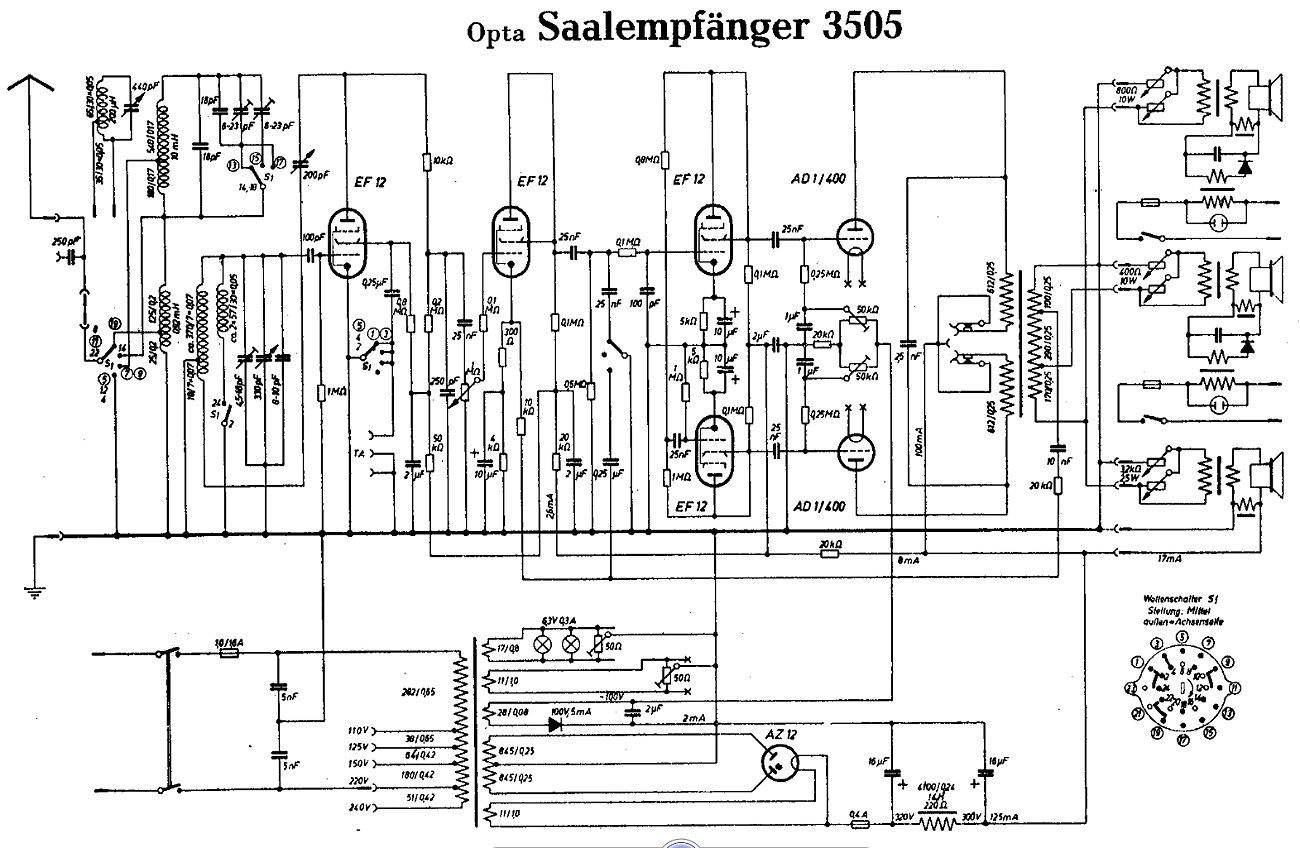 für die Freunde des Schaltbild-Lesens hier die Kurzvorstellung des Opta Saalempfängers 3505 von 1949. Ein rückgekoppelter MW / Drahtfunk-Geradeaus-Audionemfänger mit Leistungs-Gegentaktverstärker und Fernbedieneinheit und drei Lautsprecher.