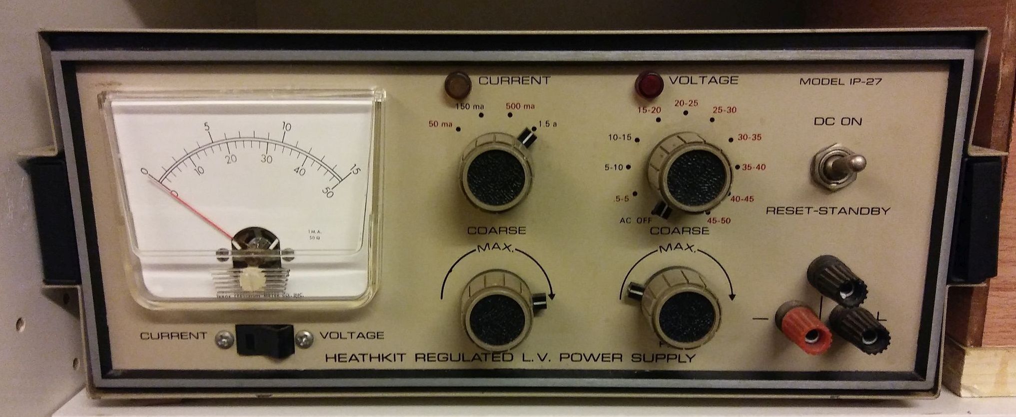 0 ... 50V = in 5V-Abstufungen mit zusätzlicher Feineinstellung. 4 Strombereiche 50, 150, 500 und 1500mA mit einstellbarer Strombegrenzung (30...100%) Lastabhängige Schwankung der Ausgangsspannung maximal +/- 15mV Restwelligkeit maximal 0,25mV Ausregelzeit maximal 25 Mikrosekunden bei 1 kHz Ausgangsimpedanz unter 0,075 Ohm von 0 bis 10 kHz, unter 0,3 Ohm über 10 kHz Umschaltbares Drehspulinstrument für Spannung und Strom (1,5%) Erdfreier Ausgang mit Kurzschluss- und Überlastungsschutz durch eingebautes Überstromrelais (Edit: Es liessen sich bei Bedarf und entsprechendem Geldbeutel mehrere IP-27 parallel und/oder in Serie schalten!) 5 Transistoren, 2 Zenerdioden, 7 Dioden Leistungsaufnahme maximal 135 VA Abmessungen 335 x 131 x 280 mm Gewicht 6kg