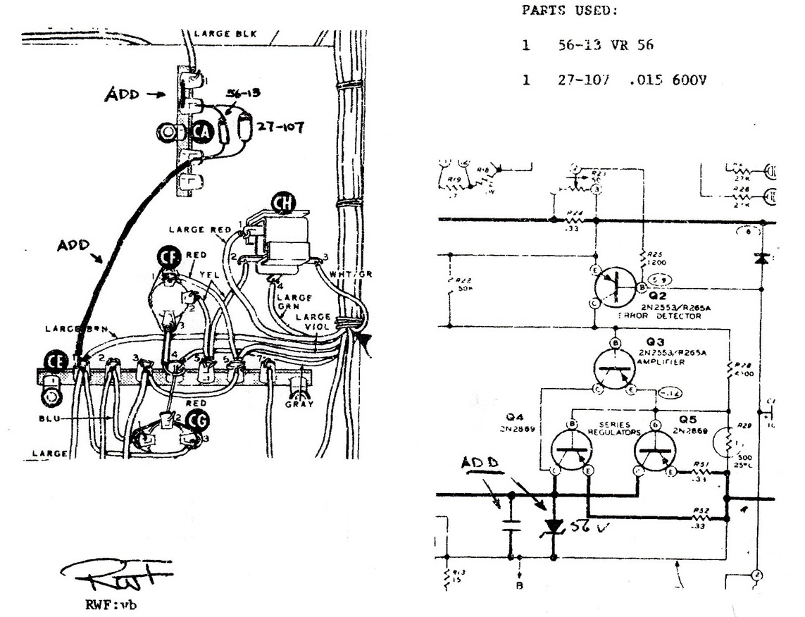 Dieser Zusatz fehlt in meinem Exemplar und war mutmasslich für das Transistorsterben verantwortlich. Heathkit ergänzte die zur Reparatur eingeschickten Netzteile stillschweigend und ohne Kommentar mit diesen Bauteilen. Wenn man etwas Zeit hat, kann man sich bei U-tube das Gerät und seine Restaurierung ansehen: