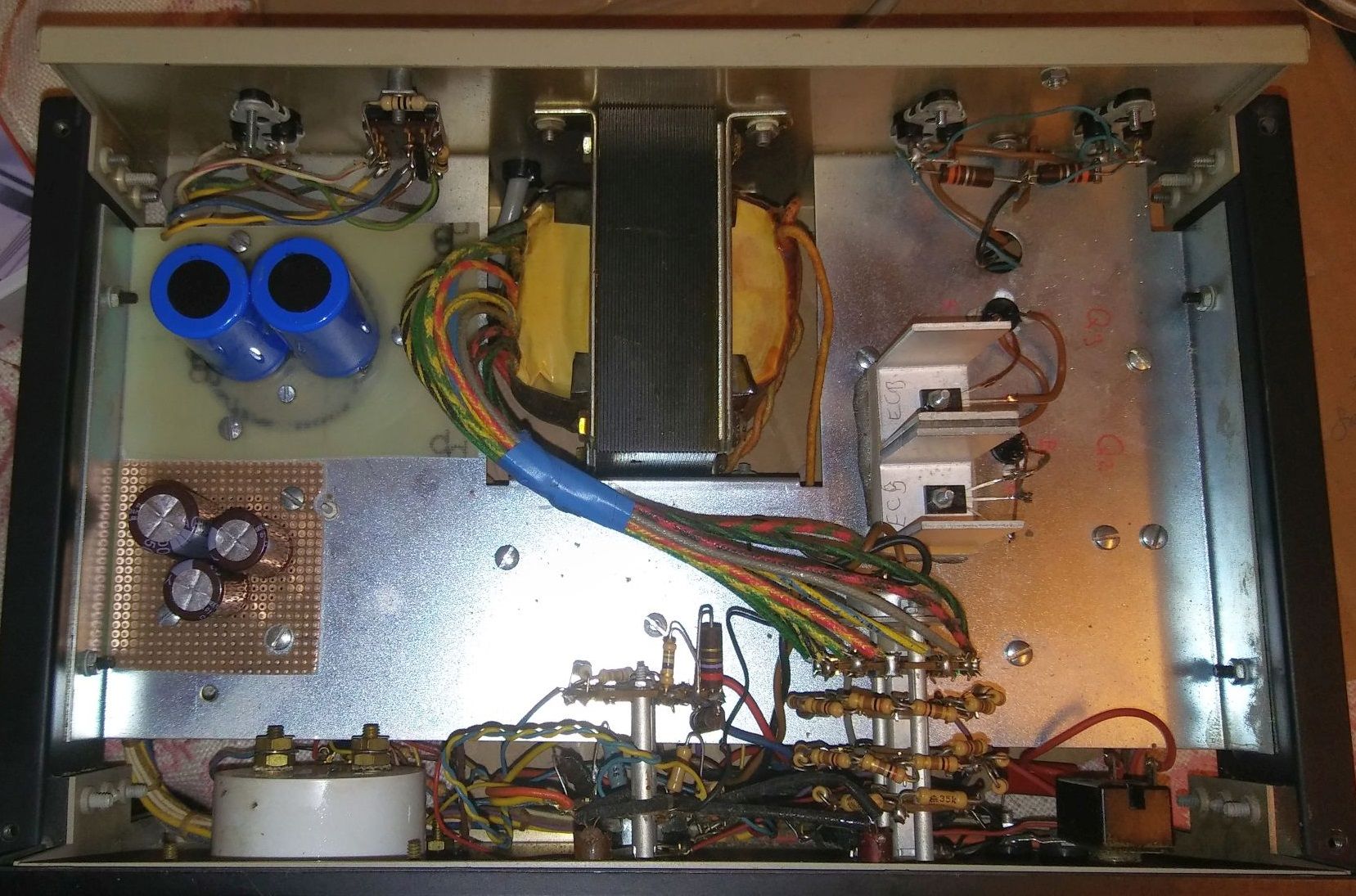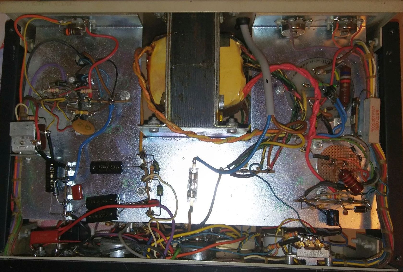 Ersten Messungen zufolge ist der Transformator (3 Wicklungen, eine Wicklung mit 10 Anzapfungen!) und das Messinstrument in Ordnung. Die Elkos und einige Dioden sind defekt.