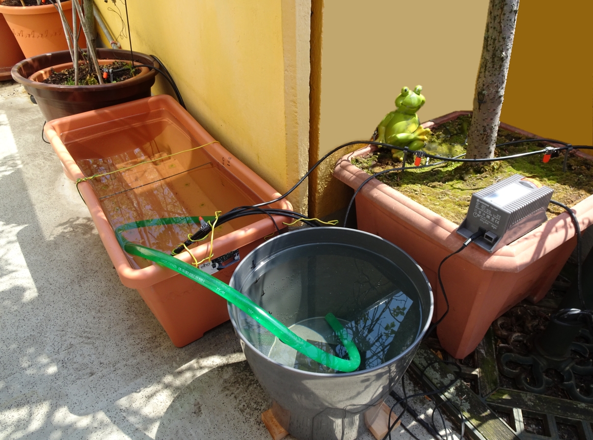 Hier ein Foto (weiter unten) aus der Testphase , also noch nicht den Vollausbau. Zu sehen ist ein mit 65 Liter Wasser füllbarer Pflanzkübel und ein Pflanzkübel mit 20 Liter Volumen, zusammen 85 Liter, jetzt nutze ich 100 Liter. Das System wird also nicht an die Wasserleitung angeschlossen, sondern erhält alle paar Tage über einen 15 Meter Schrumpfschlauch Nachschub aus dem Küchenwasserhahn in die beiden abdeckbaren (sonst Gefahr der Algenbildung) Wasser-Kübel.