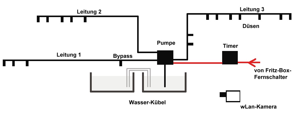 Noch komplizierter: Eine wlan-Kamera hat den Pumpen / Wassertank-Bereich im Auge. Ich kann also auch aus der Ferne feststellen, ob das Wasser zur (gefährlichen) Neige geht.