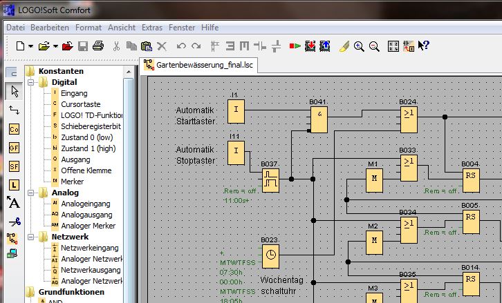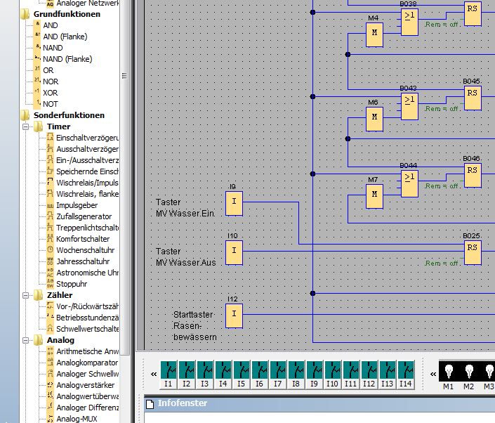 Um was geht es? Der Rainer hat hier einen Bewässerungsautomat, der aber nur eingschränkt in den Möglichkeiten ist. Wenn der Elektriker früher was steuern wollte, so baute er ganz früher Relaisschaltungen (Schützschaltungen) in fest Verdrahteter Logik. An diese angeschlossen als Eingangsgeber können verschiedene Geber sein wie z.B. Treppenhausautomat, Zeitschaltuhr, zeitgesteuerte Relais, Schalter, Lichtschranken, Schwimmerschalter, manuelle Taster, Programmwahlschalter u.s.w. Dann wollte man von der festen Logik wegkommen und erfand SPS = Speicher-Programmierbare-Steuerungen, mit großem Erfolg in der Industrie eingesetzt seit den 70er Jahren. Nur sind diese aufwendig und teuer und man muss diese programieren können z.B. Siemens Simatic mit MS-DOS uralt S5, dann windowsbasiert S7 u.s.w. ich will da jetzt nicht weiter darauf eingehen. Später kam man auf die Idee, man realisiert eine Bausteinbasierte Logik, die man einfach graphisch am PC-Bildschirm realisieren kann. Digitale Gatter und Bausteine wie sie jeder Elektroniker kennt aus der Digitaltechnikschulung. Man verknüft dann diese UND, ODER, NAND, NOR etc. Glieder, RS-Flipflops etc. untereinander (verdrahtet sie am Montor) und hat so seine Funktion realisiert. Ein Beispiel in Auszügen habe ich hier. Ich entwarf auch mal für einen Freund eine Schaltung für seine Gartenbewässerung. Mit einem Tastendruck sollte eine automatische oder auch von Hand gesteuerte Bewässerung loslaufen. Sowas kann man in Siemens LOGO! verwirklichen. Einfach mal nach Siemens LOGO! suchen. Man kauft sich ein Starterkit im Koffer um 200€ und kann loslegen. Vielleicht wäre das was?