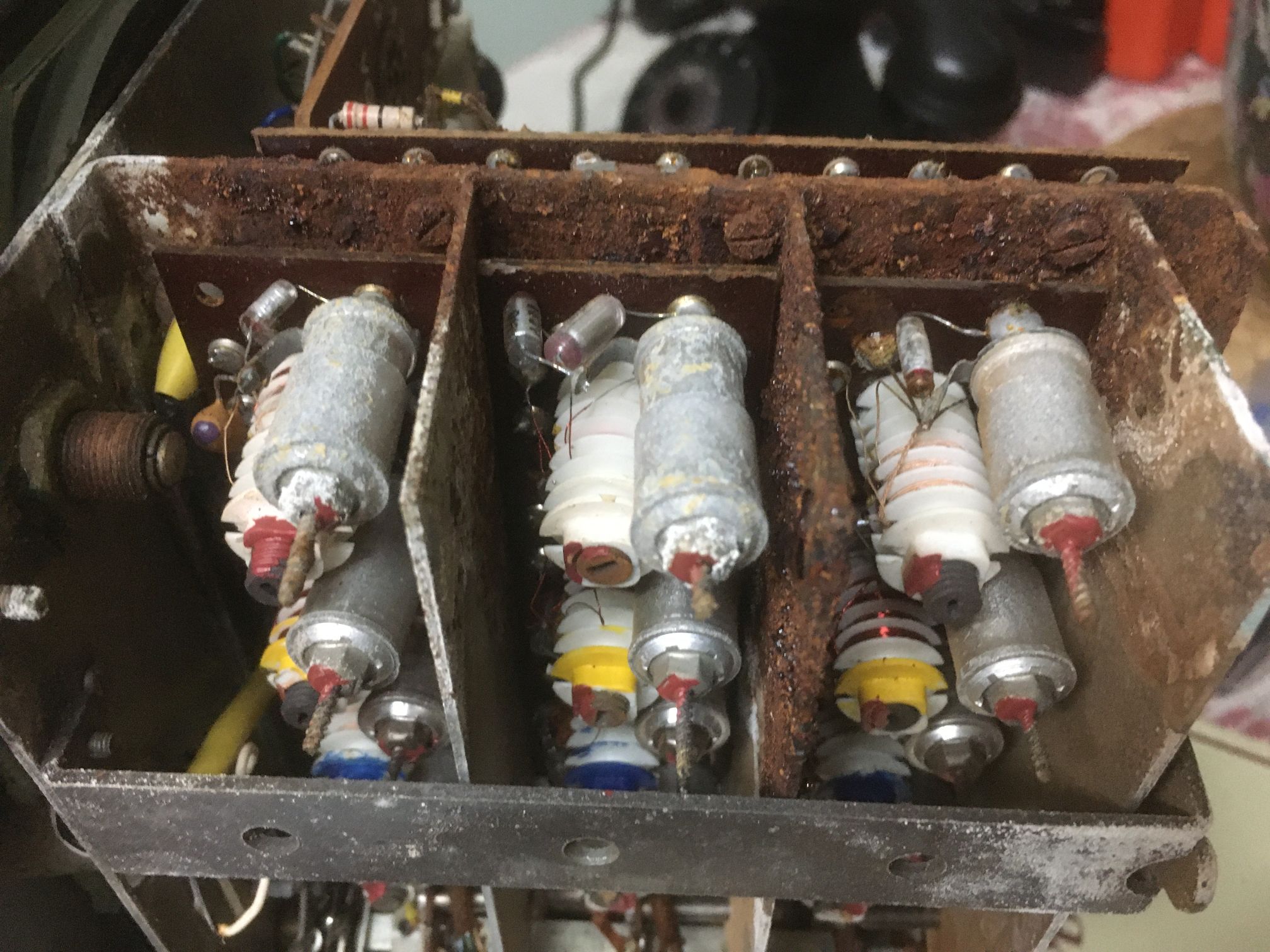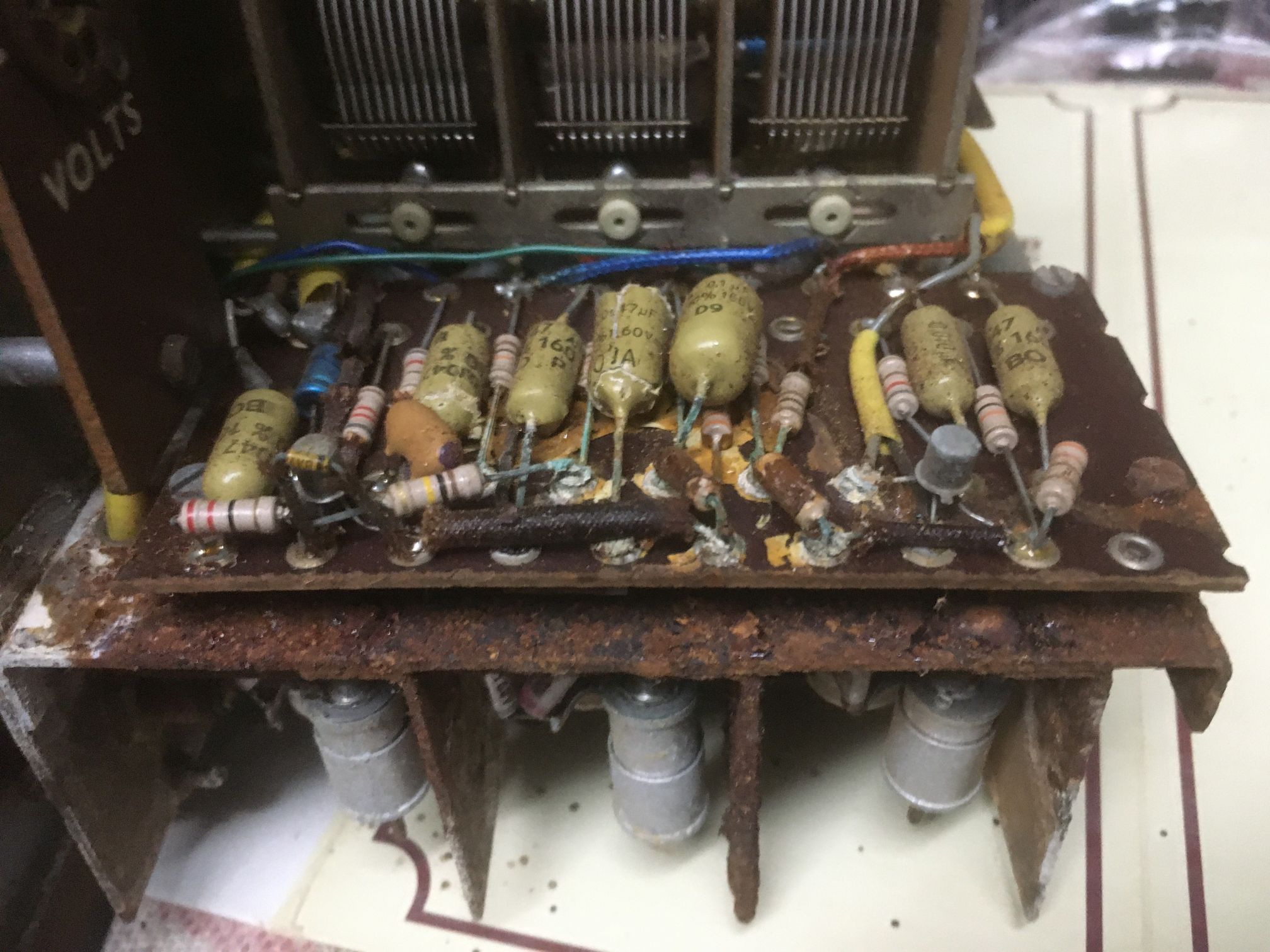 Es waren allerdings auch die 6 Monozellen, die stets für Probleme durch auslaufende Batteriesäure sorgten. Dummerweise liegt die Eingangs- und Mischstufe ausgerechnet unterhalb der Batteriehalterung. Ganz selten findet man ein Exemplar ohne Säureschäden. Mein Exemplar sah so aus:
