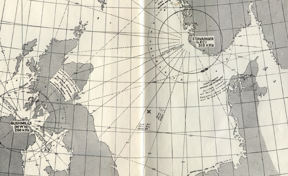 Für den näheren Bodenwellenbereich war der Apparat sicherlich zu gebrauchen. Empfohlen wurde eine Koax-endgespeiste Antenne aus 5 bis 15 Meter langer Litze. Eine solche Vertikalantenne von 9,6m Länge habe ich hier verwenden können. Das Gerät hat einen zweiten Antenneneingang für den Peilrahmen und einen Schalter für die Seitenkennung bei Überlagerung des Signals mit der Rundantenne. Das Handbuch zeigt auch die bequeme Möglichkeit der Positionsbestimmung auf, indem die Anzahl der Punkte und Striche zweier Consol-Funkfeuer ausgezählt werden. Sie lagen im heutigen NDB-Band auf 266 kHz (Bushmills, IRL, MWN) und 319 kHz (Stavanger, NOR, LEC) und erlaubten eine überschlägige Navigation ohne Peilung im Bereich der Nordsee und Teilen des Atlantiks. Die Senderleistung war auf einen Radius von 1000 km projektiert. Hierzu waren spezielle Seekarten erforderlich. Die Sender wurden 1991 abgeschaltet.