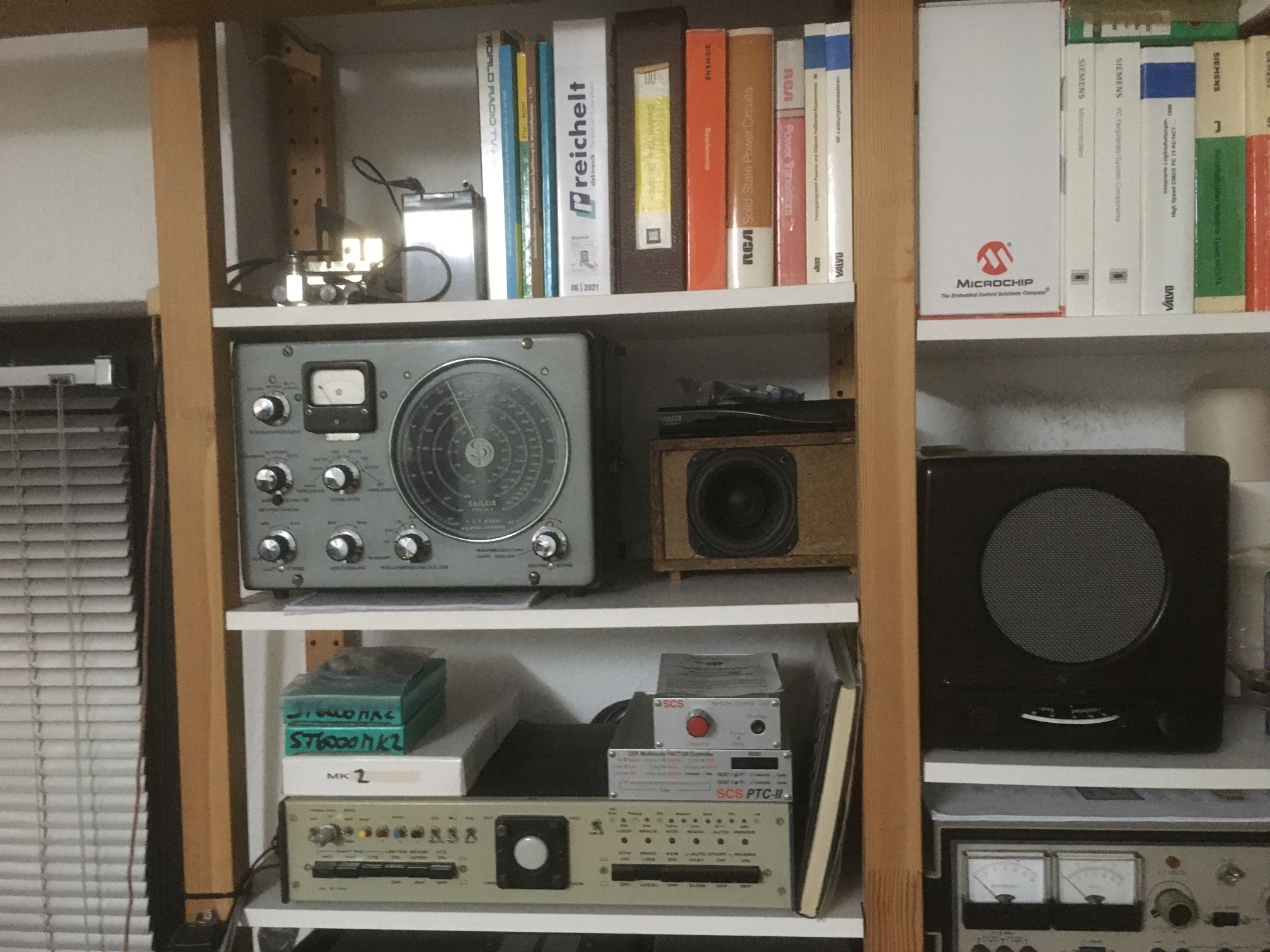 Zum koaxialen Antennenanschluss muss ich noch ergänzen, dass er hochohmig ist und die Impedanz keine 50 Ohm beträgt. Daher war meine Antennenankopplung wegen der kapazitiven Last des Kabels etwas problemtisch. Ich habe (nur für den 46T!) ein einfaches Tiefpassfilter vorgeschaltet (Dämpfung ab 2 MHz) und einen kleinen Vorverstärker mit dem Transistor 2N5109 aus dem Projekt Cohiradia nachgesetzt. Jetzt spielt der Empfänger perfekt, und die Kreuzmodulation aus Mainflingen ist auch verschwunden. Die Problematik entspricht den AM-Autoradios von einst. Auch hier musste das Koaxkabel hochohmig und möglichst kurz sein. Weil ich die Antenne auch sendemässig auf 40 und 15m nutze, kommen Link- ankopplungen nicht in Betracht. Die Geräte Sailor R108 und R109 (niederohmig, Silizium- Transistoren, ZF-IC) haben schaltungstechnisch wenig mit 16T und 46T gemeinsam. Über einem Koaxumschalter hängen nun folgende Geräte an der 9,6m-Vertikal: G.209, K2, K3, TS440S, 46T. Ein Empfindlichkeitsvergleich ist also sehr einfach möglich. Externes Rauschen gibt es an dieser kurzen Antenne, die 20m vom Haus entfernt ist, nicht (eher schon an dem 15m hohen Dipol über dem Haus).