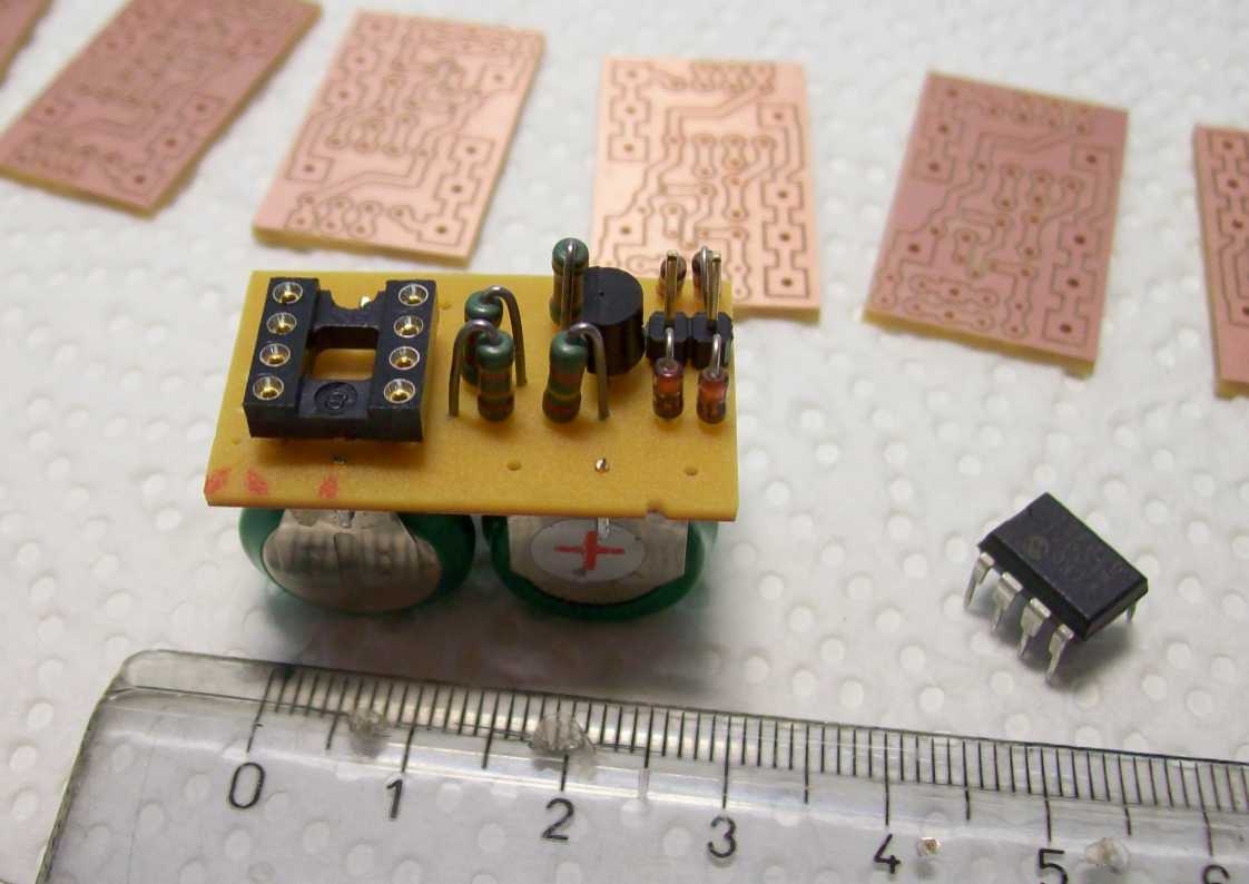 Die Versorgungsspannung beträgt 4.8V. Das Ding wird intern mit 4 MHz getaktet und per CLKOUT auf 1Mhz an dem Pin abgeglichen. Der Abgleich ist ein wenig unbequem aber so ersparte ich mir einen Quarz.