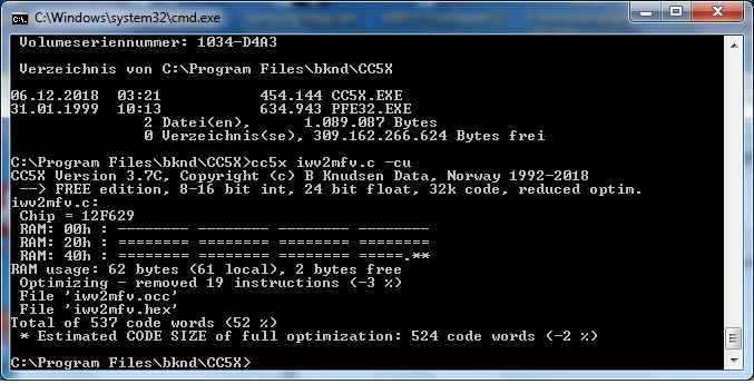 Nachtrag: CC5X in der freien Version hat inzwischen die Version 3.7c, die aber auch funktioniert: