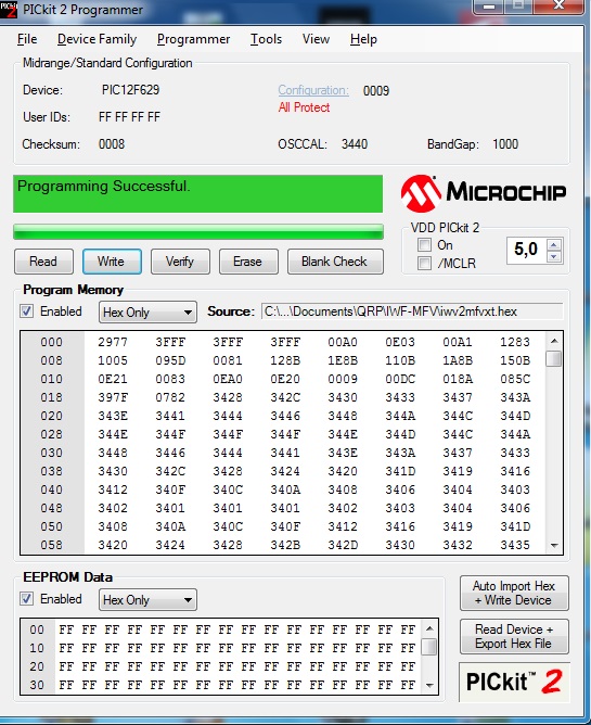 zum Aufbau der Schaltung komme ich zwar diese und nächste Woche nicht mehr, aber die Programmierung hat schon einmal mit PicKit2 funktioniert. Obwohl der Mikrocontroller in der Liste fehlte, wurde er erkannt und richtig programmiert. Vielleicht hat das Programmiergerät über das Internet ohne meine Erlaubnis nach Hause "telefoniert". Der Programmer muss zusammen mit dem Controller vor dem Start in die USB-Buchse gesteckt werden. Die Programmierspannung lässt sich zwischen 2,5 und 5V einstellen.