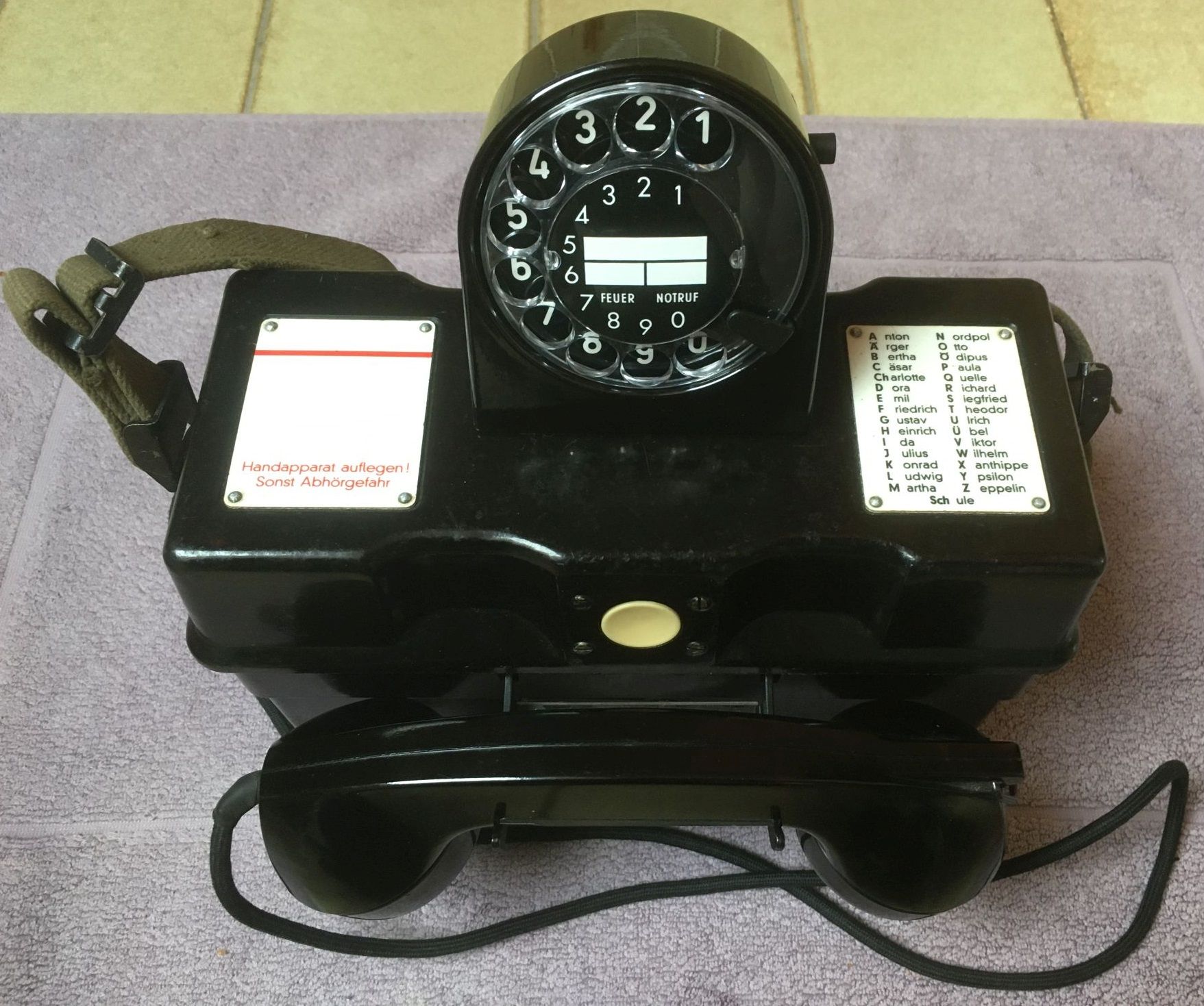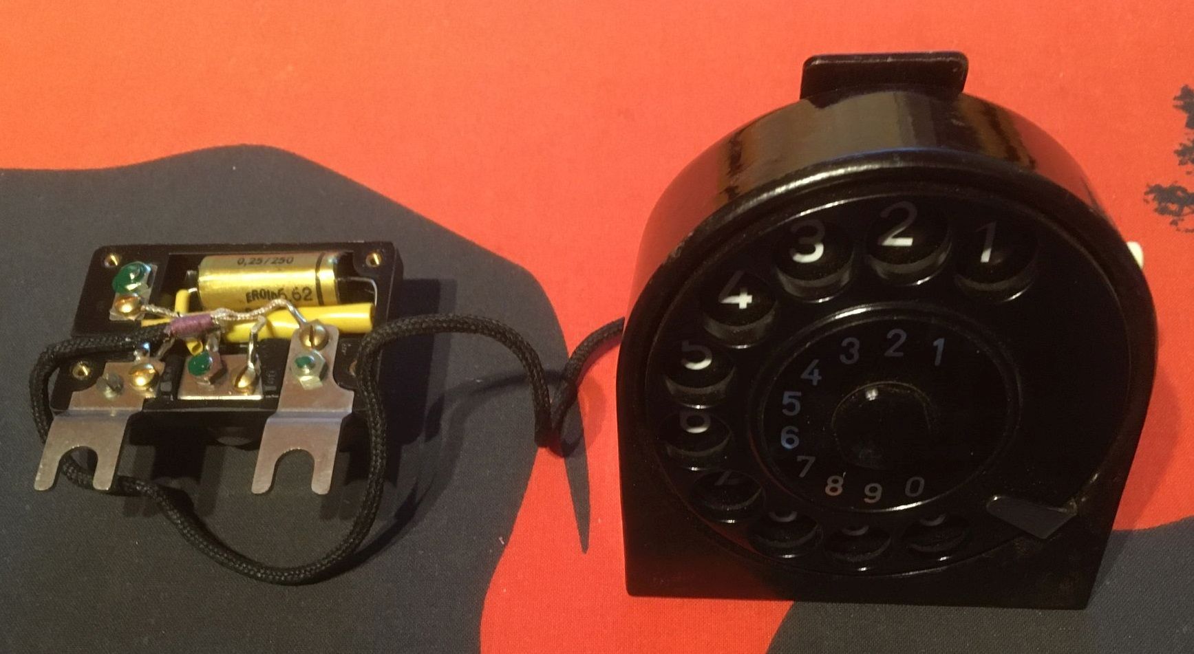 der Feldfernsprecher 54 (FF54) aus den 1980-er Jahren befindet sich offensichtlich im Originalzustand, wie eine Öffnung zeigte. Beim Handapparat bin ich mir da nicht so sicher, denn das Drücken der Sprechtaste hat keinerlei Funktion. Sie braucht zum Sprechen auch nicht gedrückt zu werden. Der Einsatz der beiden Monozellen ist auch im ZB-Betrieb (Gabel herausgeklappt) notwendig. Der Amtszusatz ist jünger und NOS, ich habe ihn aus der verschweissten Originalfolie und der versiegelten Pappschachtel herausgenommen. Man bekommt ihn für kleinen Euro in der Bucht. Die Funktion eines Nummernschalters im Zusammenspiel mit nsi/nsr hat Volker auf seiner Webseite hervorragend erklärt: