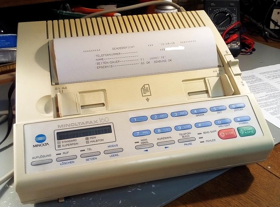 Dieser Tage hatte ich meinen Telefonfimmel auf die Spitze getrieben und ein fast 30 Jahre altes Telefax-Gerät mit Thermopapier angeschlossen, nachdem es 13 Jahre lang in einer Kiste schlummerte. Einmal draufhauen mit der Faust und es funktionierte wieder.