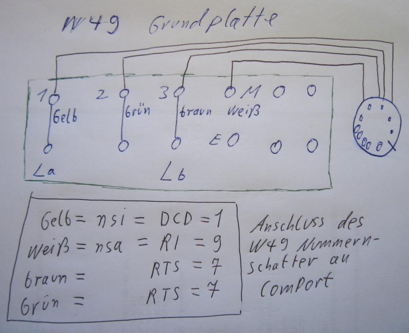 die Arbeiten habe ich an einem W49 vorgenommen. Meines Wissens sind die Nummernschalter des W48 identisch. Sie besitzen für Anschlüsse mit den Farben gelb, grün, rot, weiß. Wie diese an die serielle Schnittstelle für das Windows-Programm "NummernschalterPrüfer.exe" anzuschließen sind, zeigt die nachfolgende Skizze: