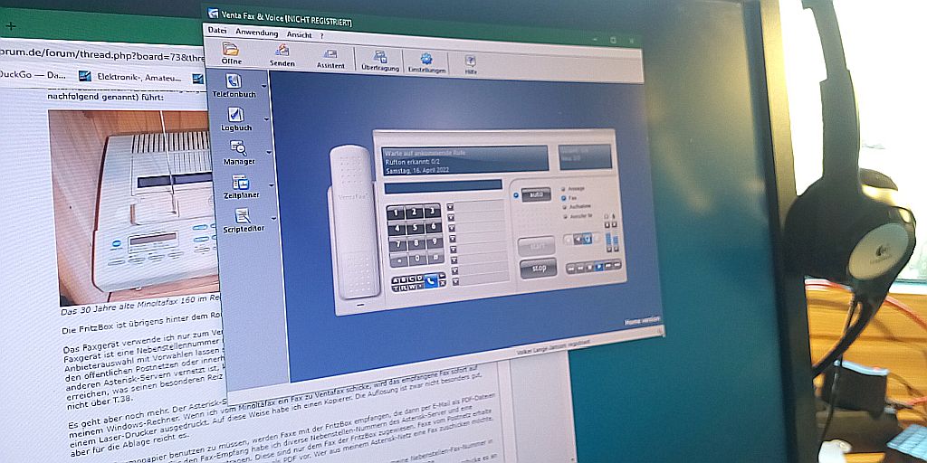 Es geht aber noch mehr. Der Asterisk-Server enthält eine Nebenstellennummer zum dem Softphone-Fax Ventafax auf meinem Windows-Rechner. Wenn ich vom Minoltafax ein Fax zu Ventafax schicke, wird das empfangene Fax sofort auf einem Laser-Drucker ausgedruckt. Auf diese Weise habe ich einen Kopierer. Die Auflösung ist zwar nicht besonders gut, aber für die Ablage reicht es.