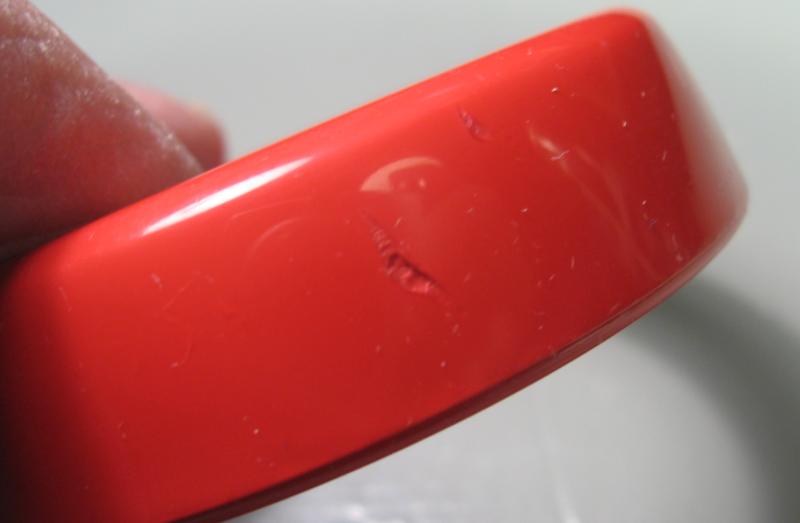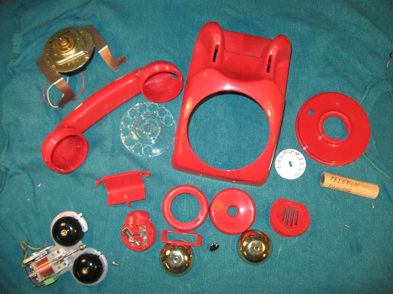 heute hatte ich auf einen schwedischen Flohmarkt ein rotes Wählscheibentelefon Modell "Dialog" fast umsonst bekommen, da jemand vorher unsachgemäß das Telefon zusammengebaut hatte, weshalb die Wählscheibe schief sitzt. Ansonsten der übliche Dreck inklusive Ohrenschmalz und normale Gebrauchsspuren, weshalb ich den Apparat zerlegte und alle Einzelteile reinigte. Leider sieht man auf den Bildern die Kratzer und den Dreck nicht. Die Kunststoffteile wurden geschliffen und poliert. Den Zeitaufwand dafür hatte ich unterschätzt. Dafür sind die meisten Macken herausgeschliffen und wegpoliert. Zur Verwendung kamen 400er- und 1200er Schleifpapier für den Nassschliff, Chromglanz (Rubbing) und Autolackreiniger (Cleaner), der schließlich den Hochglanz erzielte.