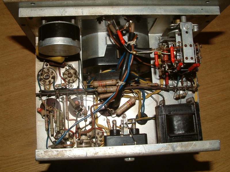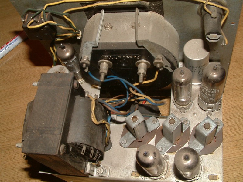 Die Beleuchtung beseht aus zwei Bajonettglühlampen, eine davon ist kaputt. Deren Fassung hab ich bis zur Beschaffung eines Ersatzes nicht wieder festgeschraubt. Jetzt will ich noch versuchen mit Hilfe eines Post-Tonfrequenzmessers, der noch einigermaßen frisch ist, eine Art Abgleich durchzuführen.