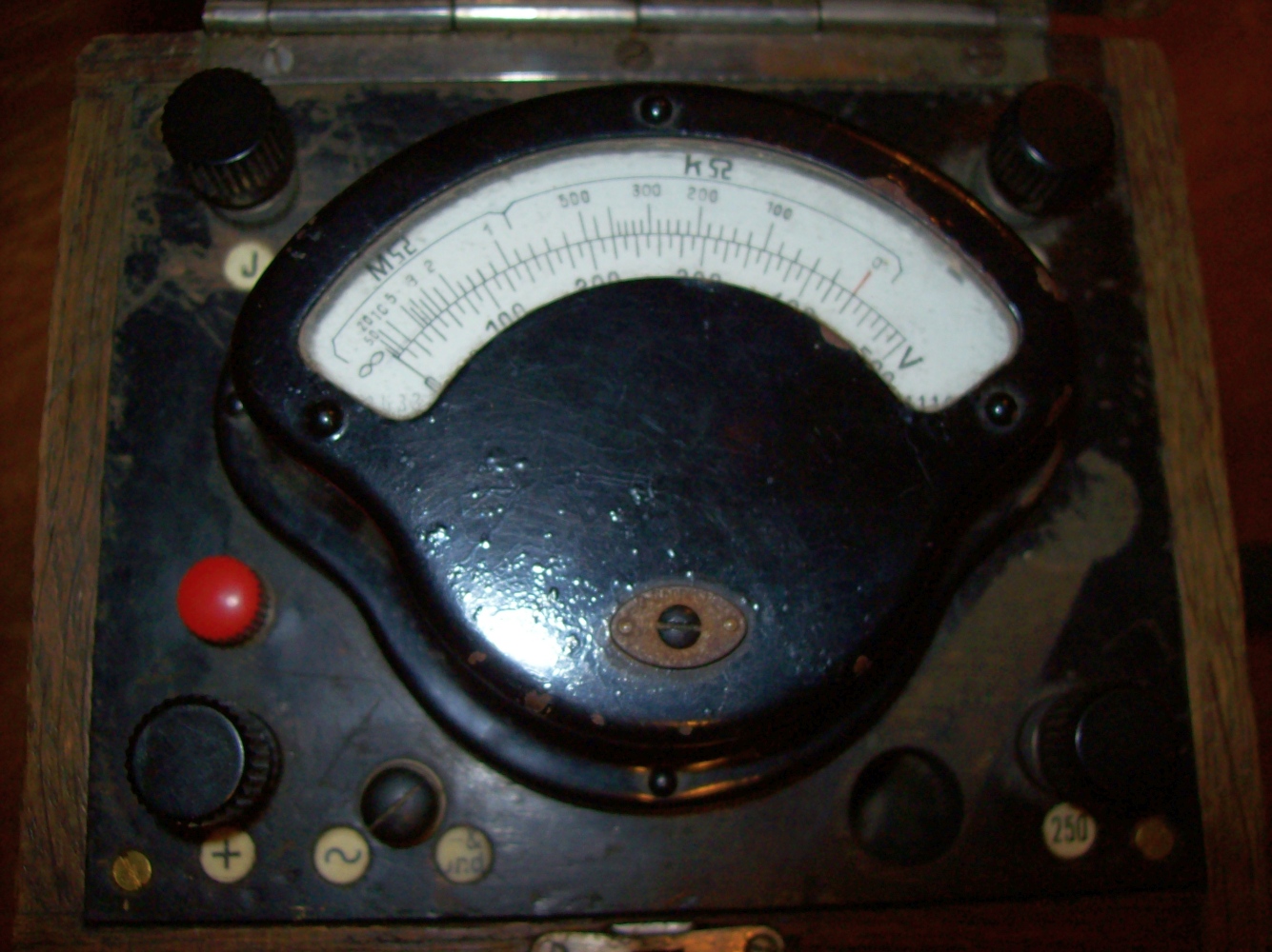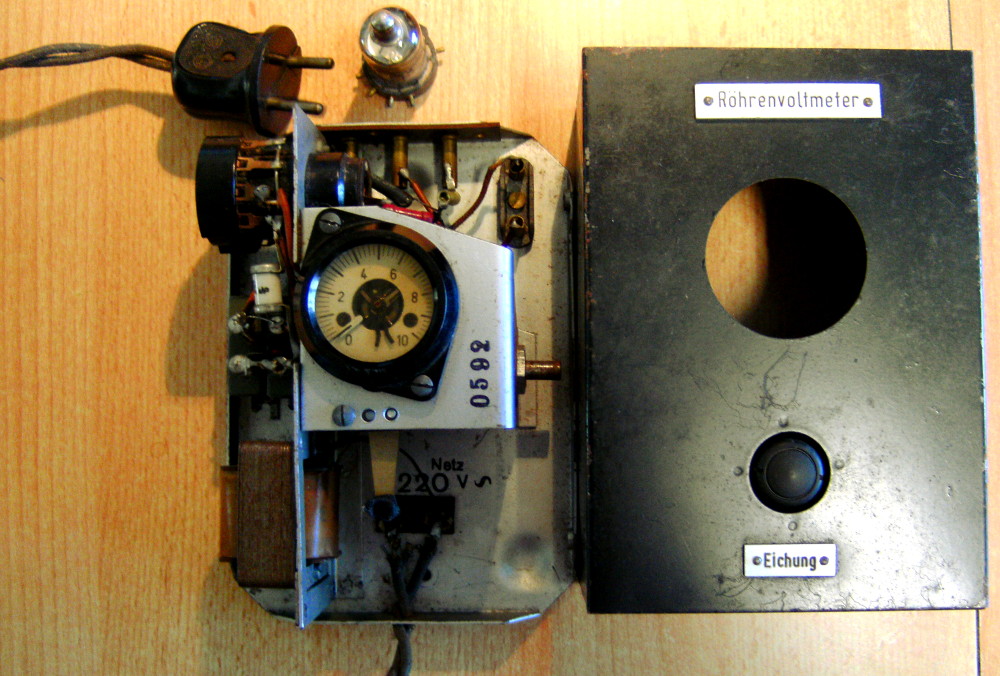 Ein Historisches Röhrenvoltmeter. Es muss aus der Zeit des 2. WK sein, im inneren werkelt eine RV P 2000 der Wehrmacht. Das ganze scheint noch im Originalzustand zu sein. Auf eine Instandsetzung verzichte ich, nur etwas gereinigt. Nur gucken, nicht mit arbeiten.