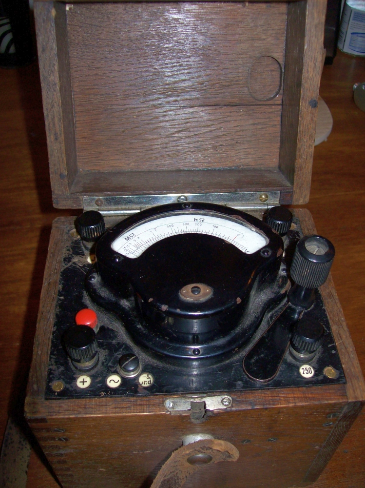 Ich habe einen Kurbelinduktor/Isolationswiderstandsmessgerät im Holzkasten, leider auch keine Herstellerbezeichnung oder Modell/Typ. Meinst Du sowas? Habe das Teil für 5,50 Euro in der Bucht erstanden:
