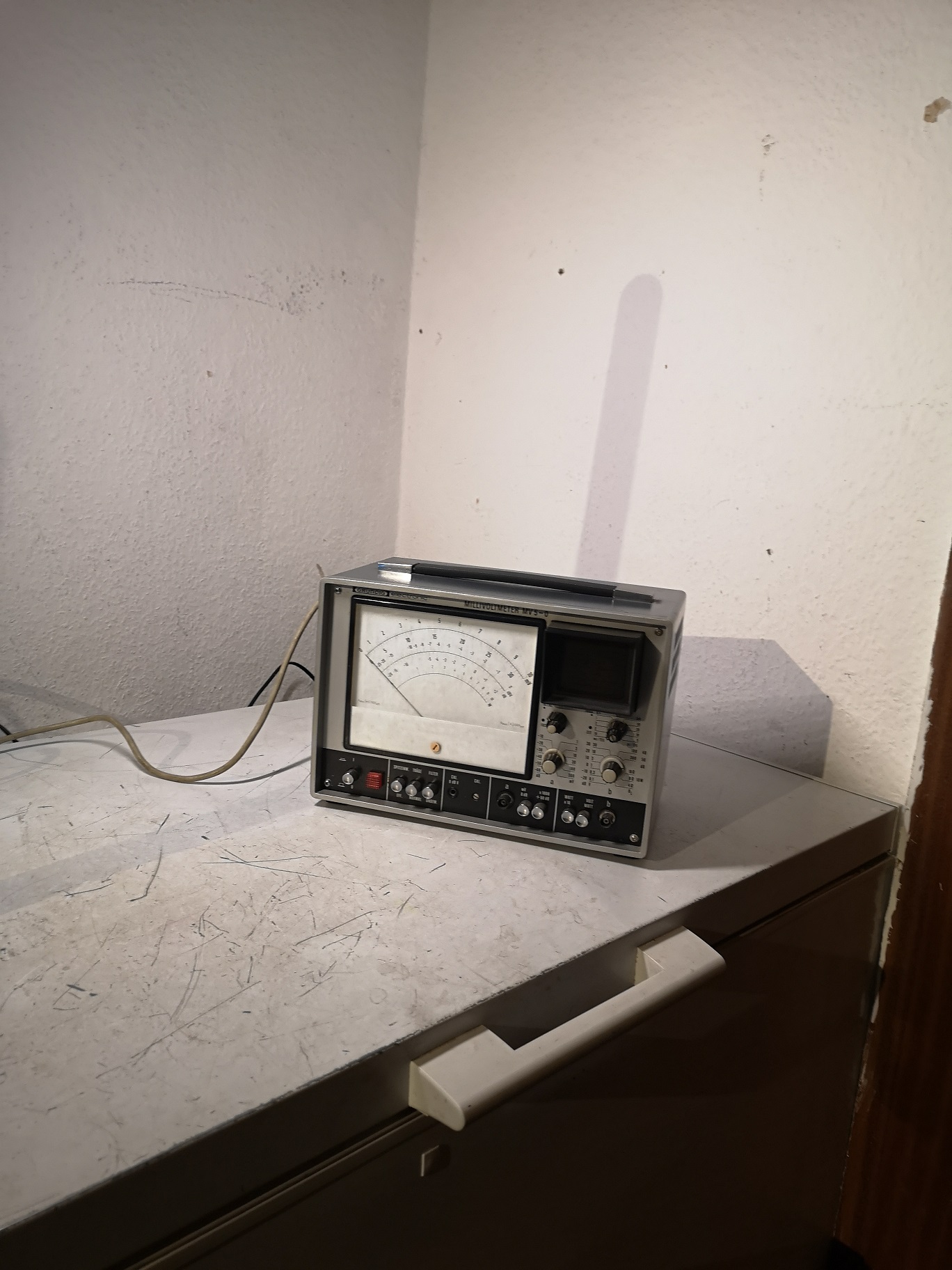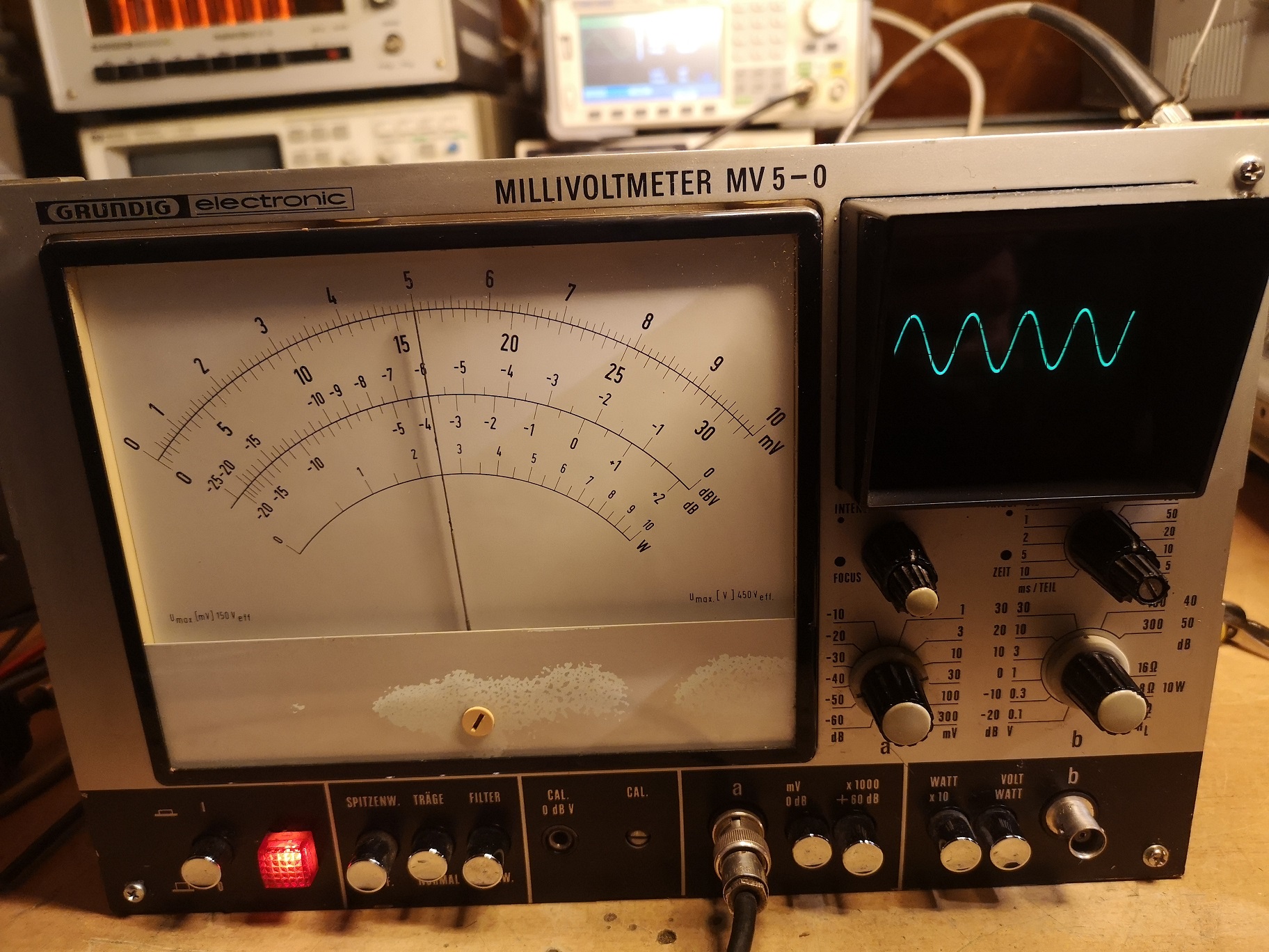 MV5-O ist die Version mit Oszi, es gibt auch ein MV5. Das Gerät kann neben Signalhöhenmessung auch Lautsprecherpegel in W, bezogen auf 4,8,16 Ohm messen und die zugehörige Amplituge gut getriggert anzeigen. Der innere Aufbau ist schon etwas abschreckend, vor allem diese unmögliche Menge von Trimmern.