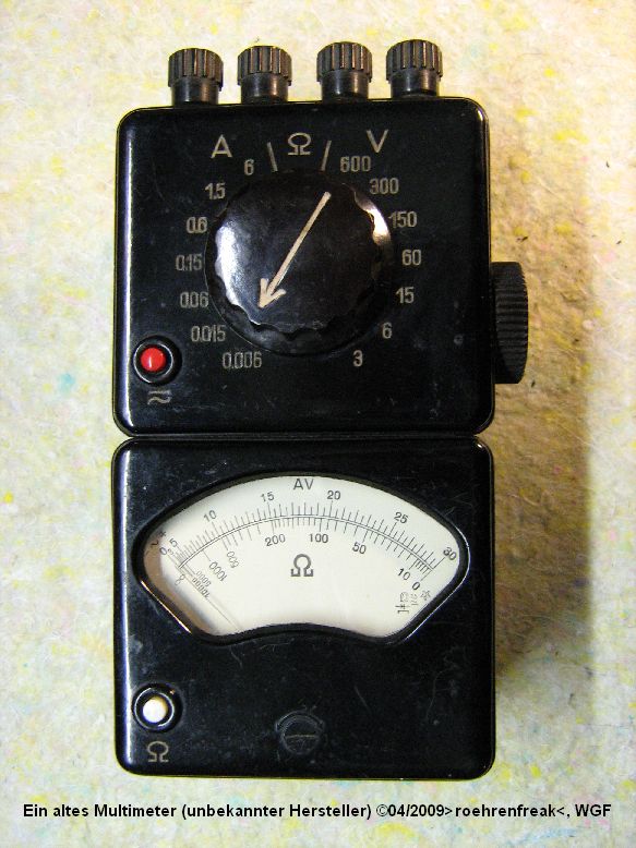 hier stelle ich ein altes Multimeter vor. Mir sind weder Hersteller noch Baujahr bekannt und so hege ich die Hoffnung auf eure Mithilfe. Der Aubau gleicht zweier, aneinander gefügten Auf-Putz-Verteilerdosen aus Bakelite, für die Widerstandsmessung wird ein 4,5-Volt-"Flachmann" benötigt. Sorry - mehr kann ich leider nicht sagen... Vielen Dank im Voraus für eure Bemühungen!