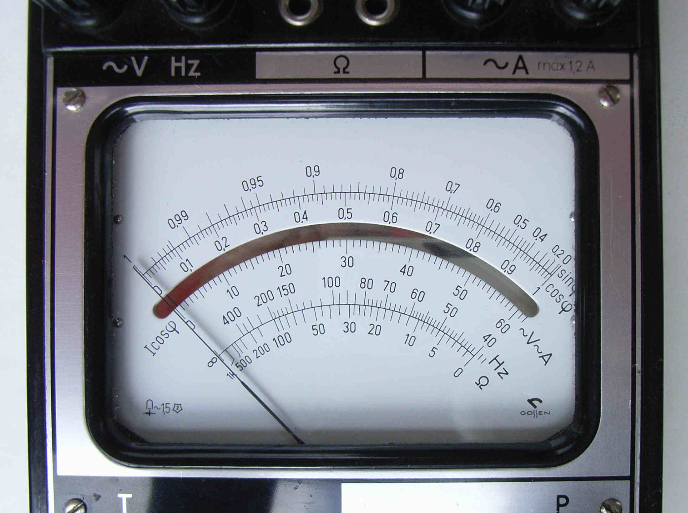 Das Uphi von Gossen ist ein reines Wechselstrom-Meßgerät. Es wurde auch von H+B unter dem Namen „Elavi Phi“ verkauft. Ich lernte es so um 1960 kennen und mögen. Zu der Zeit war in in einem Labor für Stromversorgung eines größeren Bremer Industriebetriebes als Mechaniker tätig. Mit dem Uphi können Wechselspannungen von 12-600V und -ströme von 60 mA bis 120A gemessen werden. Außerdem Widerstände und Frequenzen von 40 Hz bis 4kHz. Eine cos phi-Messung ist mit diesem Gerät ebenfalls möglich. Als ganz schön vielseitig dies Ding - für Starkströmer. Das Gehäuse ist montagegeeignet robust aus Stahlblech. Die Bedienungsanleitung ist unverlierbar im Deckel. Der Innenwiderstand ist nicht gerade hoch. Gemessen habe ich, weil eine Angabe am Gerät fehlt, bei 12V 24 mA Stromaufnahme = 41,6 Ohm/V, bei 60V 4,25 mA = 14,1 kOhm = 235 Ohm/V und bei 120V 2,2 mA = ca. 450 Ohm/V. Naja, es ist eben für Starkströmer gedacht. Schön ist, daß bei diesem Gerät Spannung und Strom gleichzeitig angeschlossen werden können und mit dem Meßartschalter zwischen beiden umgeschaltet wird. Mit demselben Schalter können Frequenz- und cos phi-Messungen geschaltet werden.
