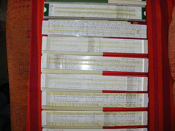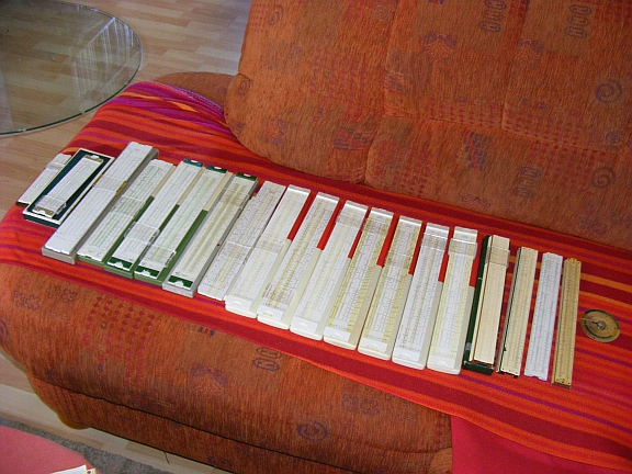 Hallo Joe Einen der Stäbe, welcher weiss ich nicht, da manche doppelt vorhanden sind, stammt von meinem Hausgeist. In der großen Truhe, mit Plänen und Büchern, lag er ganz unten auf dem Boden. Sauber verpackt, fast wie neu. Einige stammen noch von meinem Vater, zwei hatte ich mir in meiner Lehrzeit und für einen Fernlehrgang bei Christiani-Elektrotechnik - zugelegt. Die Anderen wurden im laufe der Jahre auf Flohmärkten erstanden oder wurden mir von Bekannten geschenkt. Für einige Exemplare habe ich noch die Rechen-Anleitung. Für den ständigen Hausgebrauch dient mir der ganz kleine Rechenstab auf dem Photo. Auf meiner ehemaligen Arbeitsstelle wagte ich einmal einen Rechenwettbewerb mit den Azubis. Die Jungs mit Taschenrechner, ich mit dem Rechenschieber. Ich bin zwar kein Rechenschieberartist aber bevor die mitleidig lächelnden Herren Azubis ihre Zahlen eingetippt hatten sagte ich den Lehrlingen das Ergebniss der vom Laborchef aufgegebenen Aufgaben. Der Laborchef war auch ein Stabrechner. Als er in Rente ging vermachte er mir seinen alten Holzrechner von Nestler.