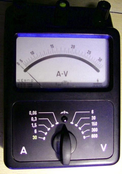 Gut, fangen wir rechts unten an, mal was anderes. Nämlich ein Dreheisen - Messinstrument. Für Radio und Fernsehmessungen eher ungeeignet, mit der Ausnahme der eff. Wechselstrom u.- Spannungsmessung am Netzteil im Wechselspannungsteil wenn es "kräftig" ist. Es ist ein Siemens Multizet Kl 1,5. Leider fehlt das rückwärtige Schild mit dem entsprechenden Angaben über den Spannung - Stromabfall. Der Widerstand für die 30 A Messung fehlt mir auch. Musste das Foto freihändig ohne Blitz nur mit einer Lampe als Beleuchtung machen, daher ist die Qualität nicht optimal.