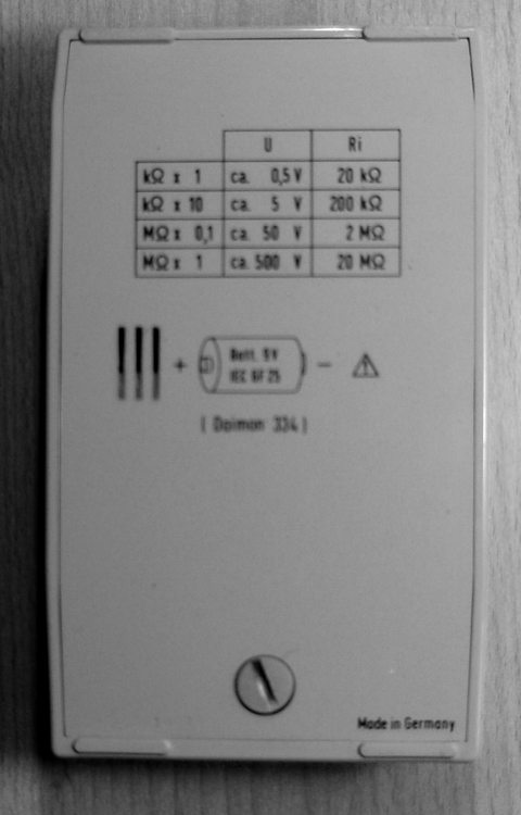 Jetzt noch das "Highlight" das Metrawid M. Es handelt sich um ein Ohmmeter mit mit einer Messpannung bis 500 V . Es erlaubt Messungen oder besser Ablesungen bis 1 Giga Für die Prüfung von alten Röhrengeräte C's genau richtig. Die Bereiche können an der Rückseite genauer gesehen werden. Einziges Problem ist die nicht mehr beschaffbare 9 V Rundbatterie, noch hält die alte. Leider macht der Autofokus der Digicam nicht so richtig mit, deshalb die nicht so tolle Bildqualität.