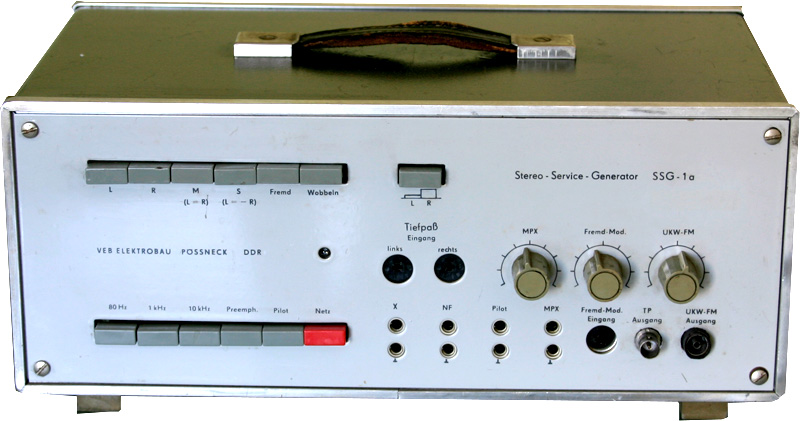 wie versprochen kommen wir nun zurück in den Arbeiter und Bauernstaat. Wir besuchen den VEB Elektrobau Pößneck. Hier wurde Anfang der 70iger Jahre mit der Serienfertigung von Stereo Prüf- und Servicegeneratoren begonnen. Der hier gezeigte Stereo Service Generator SSG1a aus dem Baujahr 1976 ist der direkte Nachfolger des noch in Kleinserie hergestellten SSG1, dessen Schaltungsentwicklung bis ins Jahr 1966 zurückreicht. Die Notwenigkeit dieser Geräte war spätestens mit dem Erscheinen der Stereodekoder StD1 und StD4 begründet.